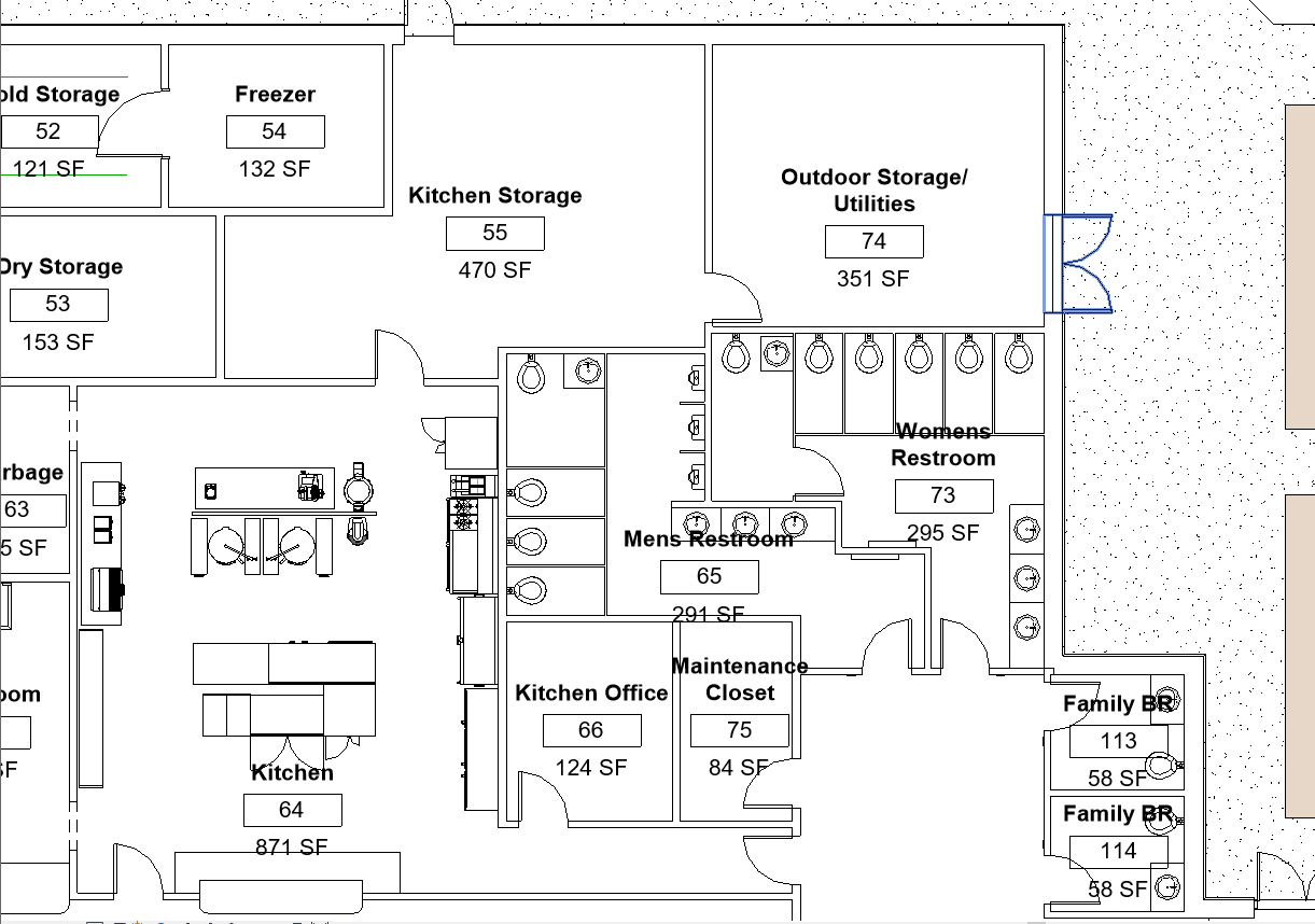 Daycare and preschool facilities will likely be a different building or in the church design. A cafeteria and gym area is on the back half. These can serve as event space. A library area is across the hall from these. A central courtyard may be used as the playground area, or outdoor classroom space.