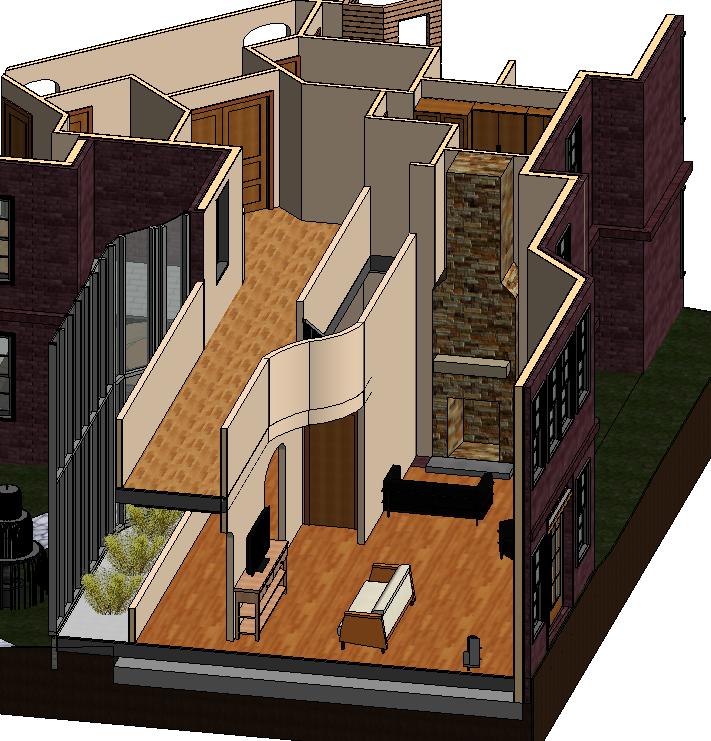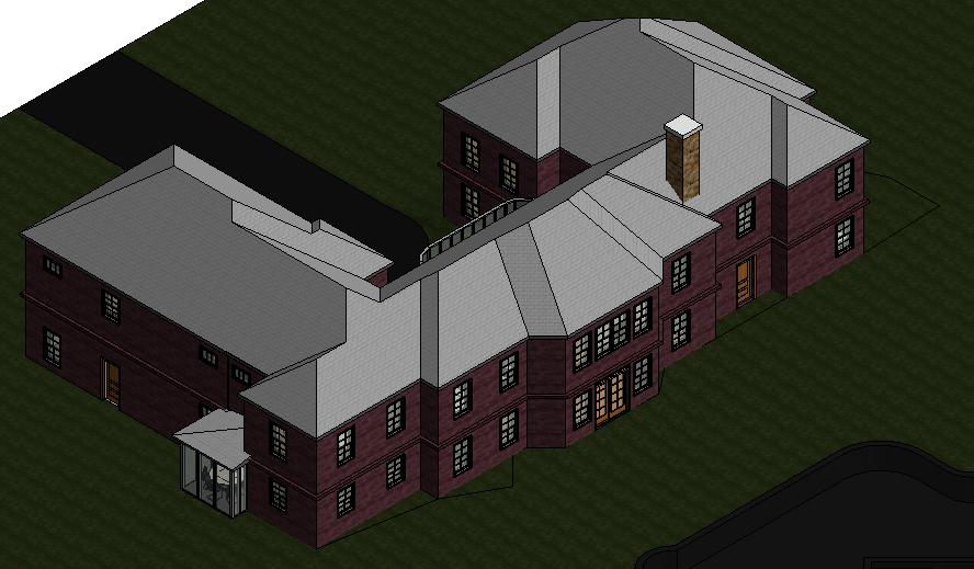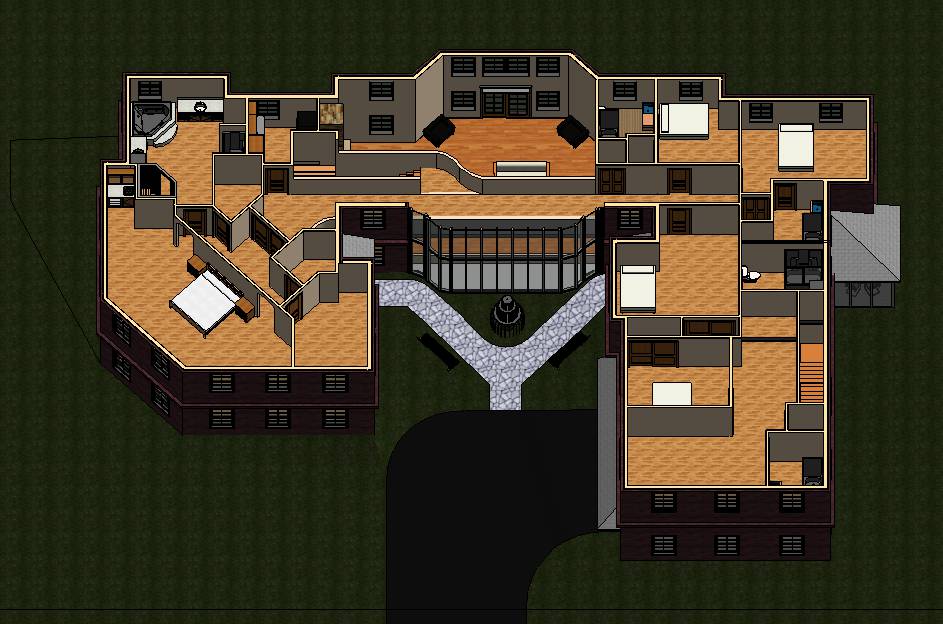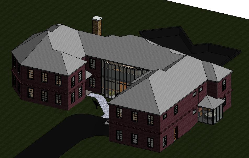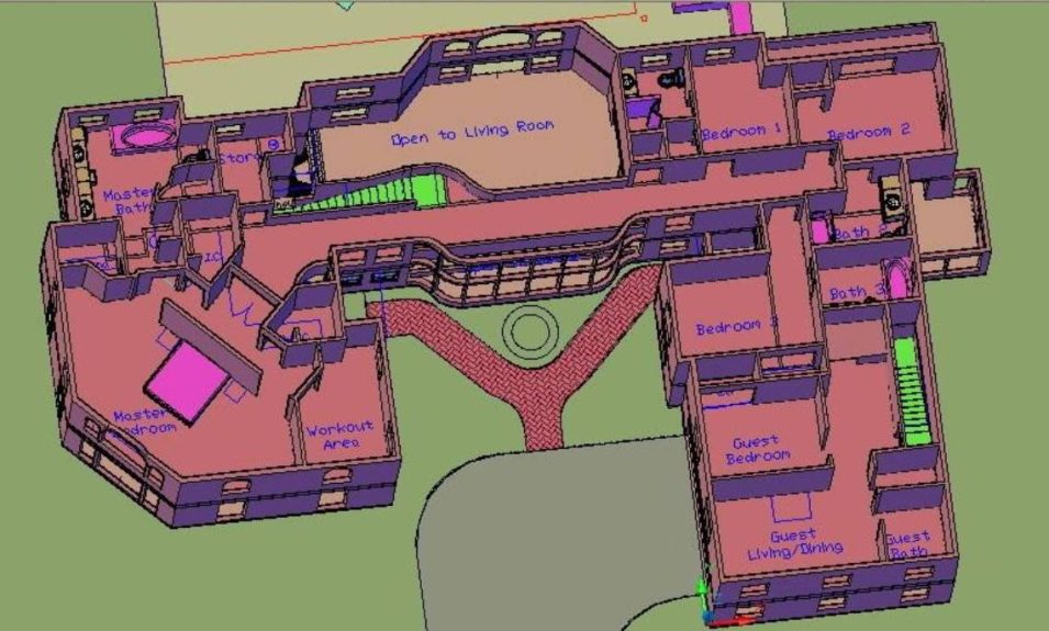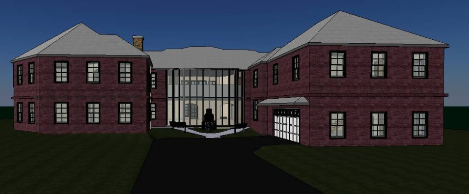 I first designed this house in 2006. The main attraction of this house is the large glass wall that greats you when you approach the house. Behind the wall is an area for a planter or indoor fish pond.This house includes a guest suite above the garage as well with a space for their own kitchenette, and a separate living room and bedroom.
