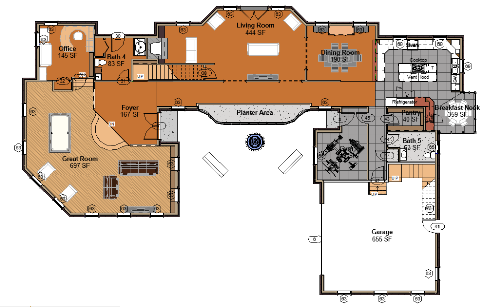 - The eating area on the 1st floor provides a large kitchen with its adjoining dining room, breakfast nook, and a large walk-in pantry/ wine cellar. Also on this side of the house, a spare room (in this case a small gym) and garage with access to the upstairs guest area can be found.