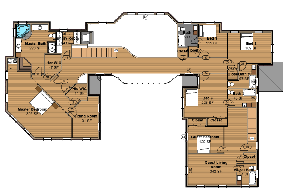 The second floor is home to the sleeping areas. On the left, you will find a large master suite, which includes his and hers walk-in closets, a large master bath with a personal sauna, and a separate sitting area or office. On the right, you will notice 3 bedrooms, each with its own private bath. The area above the garage is currently set up as a guest apartment, with a bedroom, kitchen/dining/ living area and its own bath. Different from the original design, I moved the laundry room upstairs next to the master bedroom.